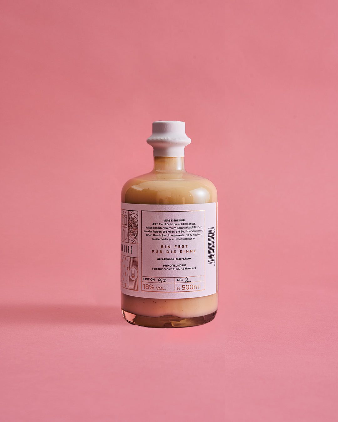 Unser beliebter AERE Eierlikör kommt in einer eleganten 500ml-Flasche mit Korkverschluss. Und damit ist unser Eierlikör nicht nur geschmacklich, sondern auch optisch ein Highlight. Das edle Etikett mit Goldverzierung macht Lust auf den ersten Schluck – und der überzeugt mit Leichtigkeit, Zitrusnoten und vollmundigem Geschmack. AERE Eierlikör eignet sich perfekt für klassische Shots, an Festtagen und zu besonderen Anlässen, in Kuchen, Torten und auf Eiscreme oder in Longdrinks & Cocktails.